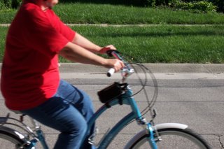 Hmmmmm . . . They're being added in backward order. Ah, well. My first comment related to the picture just above it and now we'll talk about the one above that . . . me riding down the street where you can actually see the whole bike. Notice how it looks just a little off? That's because it is. The pedals are forward of where they would typically be in a normal bike. That's so the seat can be lowered and you can still get full extension on your legs . Thus, you are closer to the ground with your feet. For people with actual legs, you should be able to touch the ground while seated, making it easier to ride around town. I can't, but it's still easier to ride around town in than my Bike E. This is called a Townie. It's very comfortable since the seating is so erect. 21 speeds and a VERY low granny gear. Just the ticket for what I'm calling "my old lady bike".