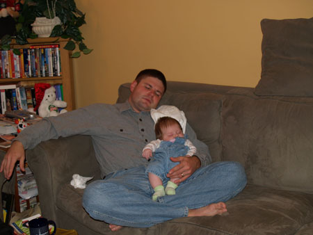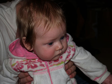 She likes to be sung to. There are lots of songs we sing to her (including one Josh came up with that's "The Hallelujah Chorus" with "Hello Ava" in place of "Hallelujah") but she seems especially fond of "Hey, Baby" (don't ask me who orininally sang it; I know it as an Iowa State pep band song) and "Head and Shoulders, Knees and Toes," which we of course do with actions pointing out each of her body parts.