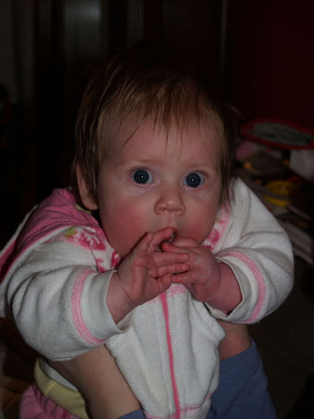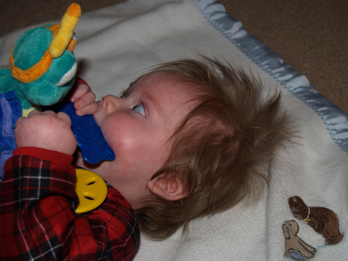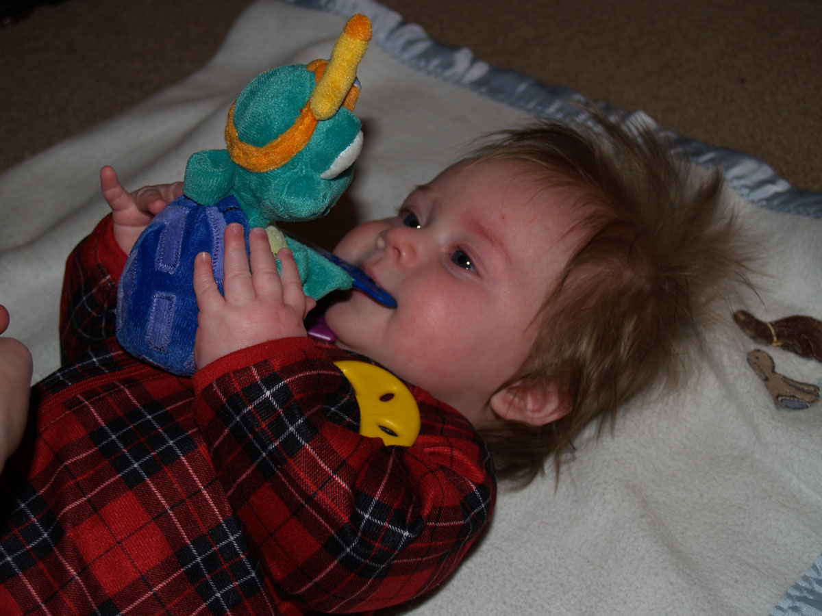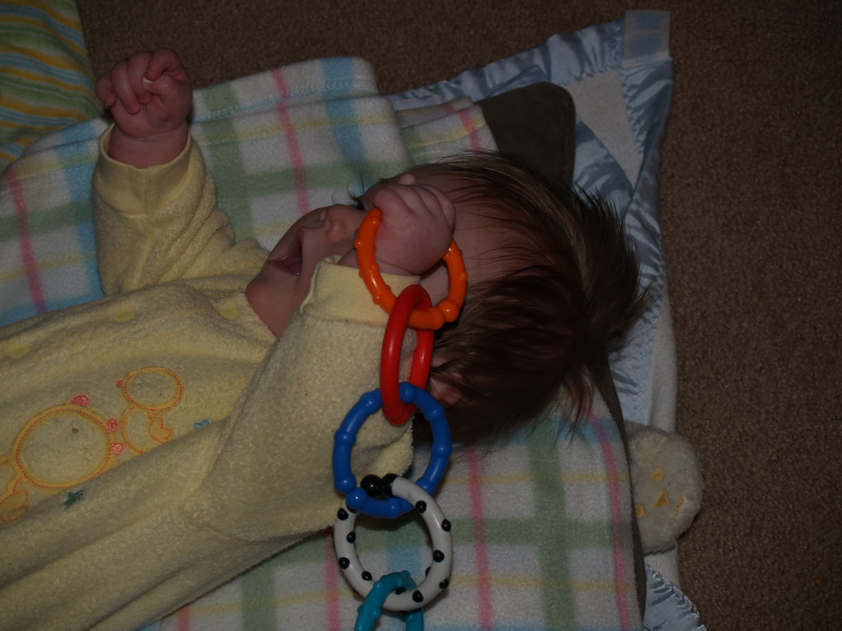 She's been a big fan of chewing/sucking on her hands for a while now, but she's recently started doing it with objects more, like the aforementioned rings and other toys we give her, some of which were designed to be chewed on (most baby toys are) and some of which aren't: we put Mr. Cowie (who is entirely plush) on her chest and she grabbed him with both hands and shoved him into her face, trying to eat him. Something tells me she's going to like her burgers and steak one day. ;-) We're not sure if she's just exploring objects with ther mouth, as babies do, or if she might actually be starting to teethe, which it seems a little early for, but isn't impossible.