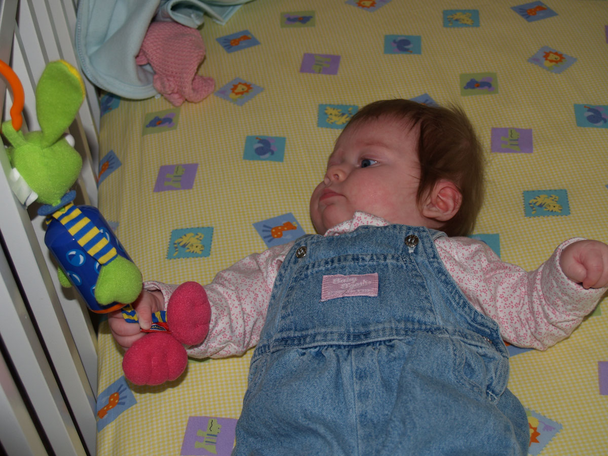 Ava has recently started becoming more "grabby." She has a jingly, dangly bunny toy on the side of her crib that she used to just bat at (or kick, if she had worked herself 90 -- or 270 -- degrees, which she started doing about a month ago), but lately she's started actually grabbing its skinny little legs and pulling it toward herself or just yanking it around. She'll also grab onto her link-a-doos (colorful plastic rings that link together) and actually hold on while she waves her arm around, tightening her grip if you pull on the other end. (Before she would occasionally close her fist around one, but would usually drop it fairly quickly because she wasn't really holding on intentionally.) And when she's on the changing table she'll usually grab onto the bars on the sides of the table with each hand. She's also started to grab onto her clothes when I'm trying to dress her, and even sometimes her diaper when I'm trying to put it on her. It's amazing how much this behavior has progressed even in just the past week or so; it's kind of fascinating to watch. My favorite manifestation of her increasing grabbiness, though, is that she grabs onto Mommy and Daddy (or our clothing -- or especially Mommy's hair) a lot more. It's very sweet. And occasionally painful. ;-)