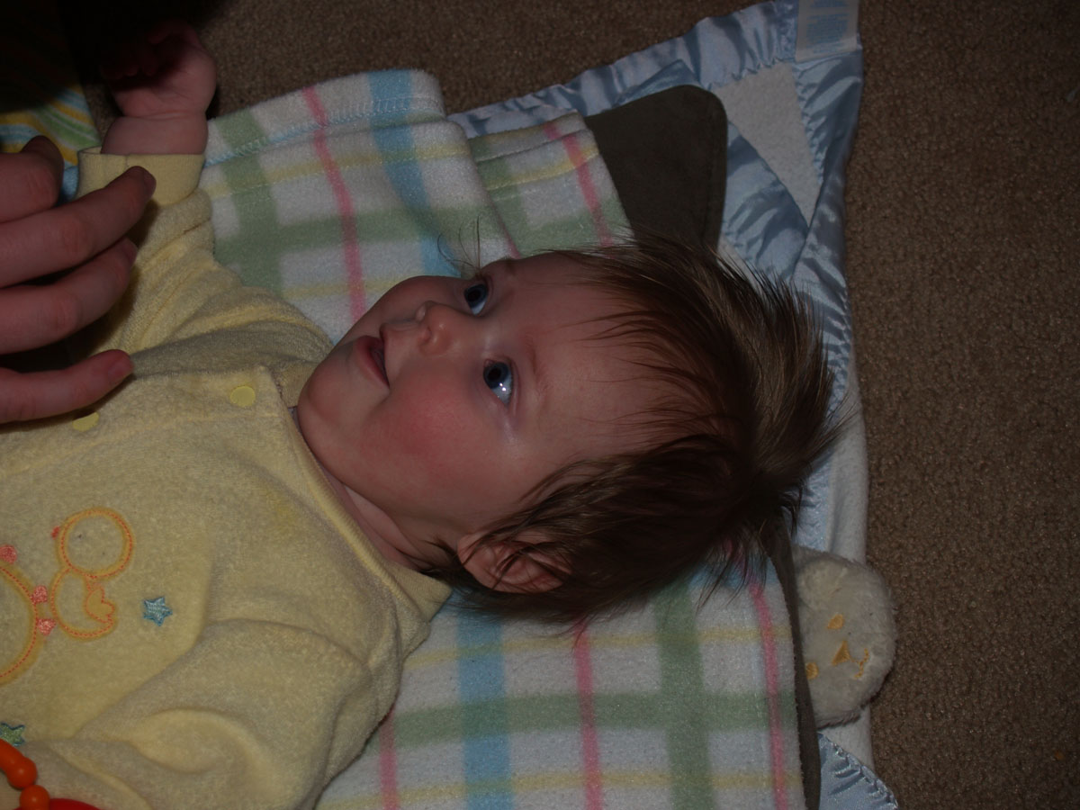 She's just started noticing everyday objects more; the other day she really started looking at the remote control in my hand, and even reached out and touched it. I noticed her doing the same thing with the diaper ointment tube and a box of crackers when they were in my hand. She's definitely not the itty-bitty, helpless thing we brought home from the hospital who paid little to no attention to the world around her.