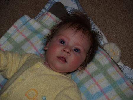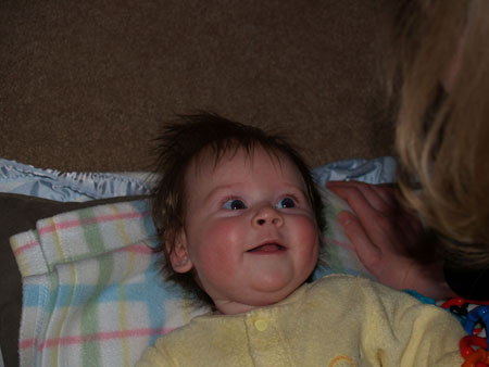 She's more vocal, too. I haven't heard what I would quite call a laugh yet*, but she makes a lot more (and more varied) sounds than she used to, at times rather rhythmically. If we manage to get a good video of some of this I'll post it.