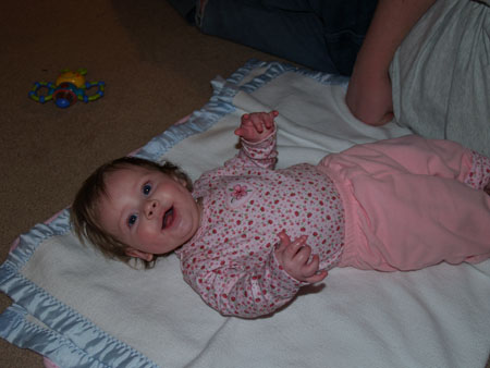In the last month she's been smiling a whole lot more (though unfortunately not much at her recent "photo shoot"), started laughing, discovered her knees, started actually paying (some) attention to the books we read her, and noticeably improved her hand-eye coordination, especially when it comes to grabbing toys and getting them to her mouth (which is pretty much where everything goes these days). If we stick a hand in front of her, she'll reach out and grab it with both hands, kind of inspect it, and then usually -- of course -- try to put it in her mouth. When she's doing something like sitting in one of our laps, she'll sometimes wiggle around until she manages to get her butt on the floor, or just plain into a different position. It's obvious she wants to be able to do more than she physically can yet, so we're going to have to really watch out once she does start to move around on her own. We also used to only have to worry about her making noise in church if she was fussy, but she's so much more vocal now that even if she's in a good mood she can be noisy. Yup, life is getting more interesting.