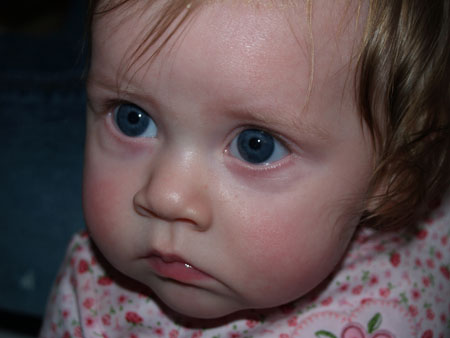 ...and we seem to have hit teething. We can't be 100% sure until we actually see a tooth breaking through, but based on several things -- including a recent night when she started crying in her crib shortly after we put her to bed and didn't stop on her own, which is very unusual at this point -- we're pretty confident that's what's going on. In other news, she seems to be about 15 3/4 pounds (we're not bothering to try to measure her length this time) and is a little rolling machine right now.