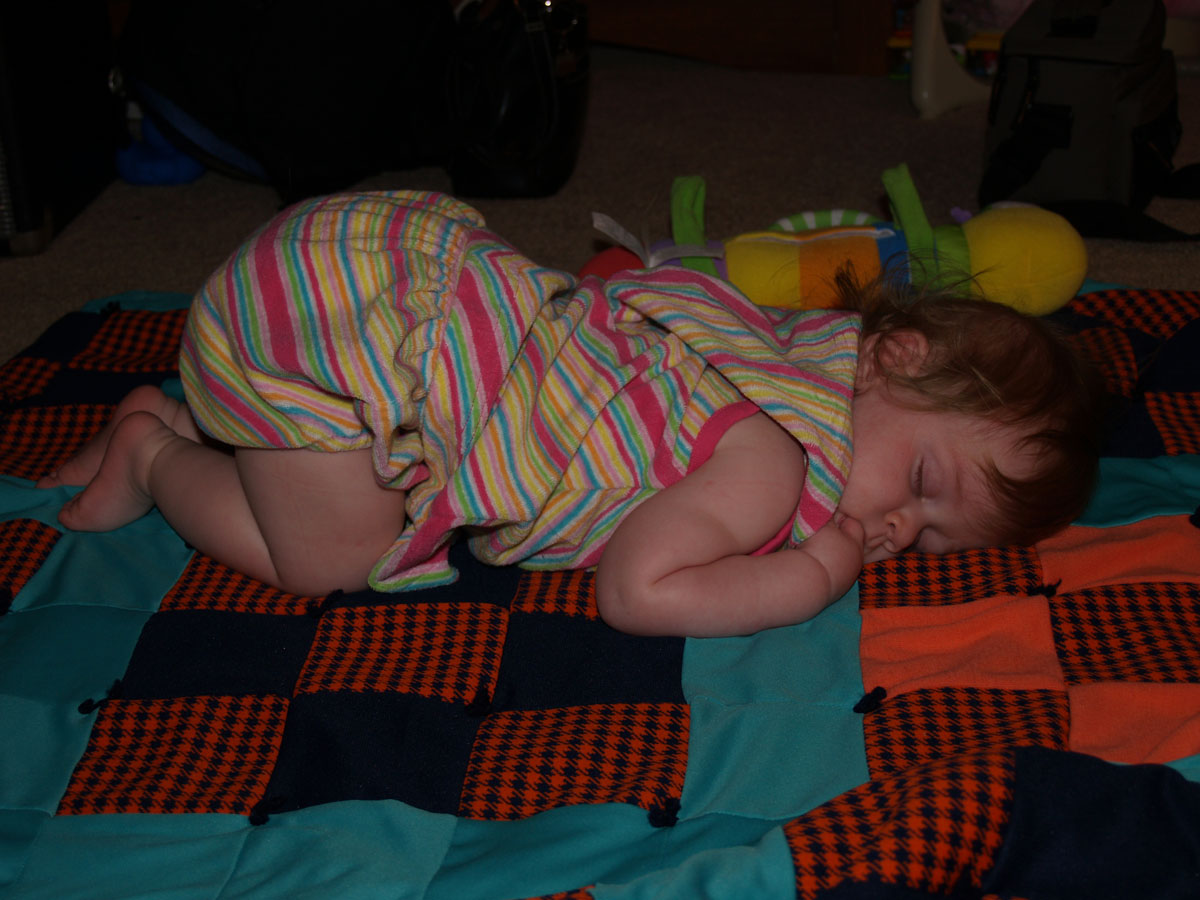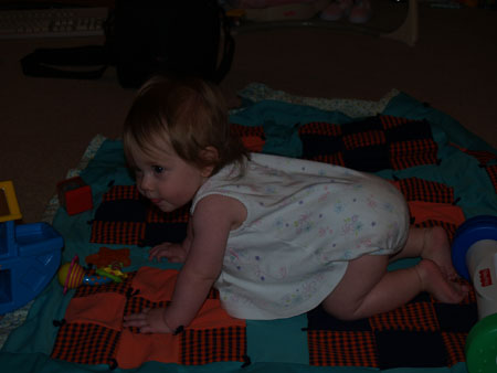 There haven't been a ton of big changes since last month, at least not the kind that are easily defined (other parents I'm sure will get how you can notice your child changing and growing, even if you can't pinpoint the exact things that have changed). She got her second tooth, of course, and can now get up on her hands and knees in a snap. She seems to get frustrated sometimes because she can't quite figure out how move once she's in that position; we're trying to show her what to do, but I don't know whether that will actually help or if it's something she just has to figure out on her own. It can't be too far off, though.