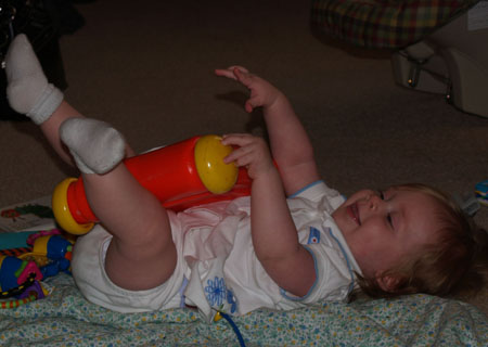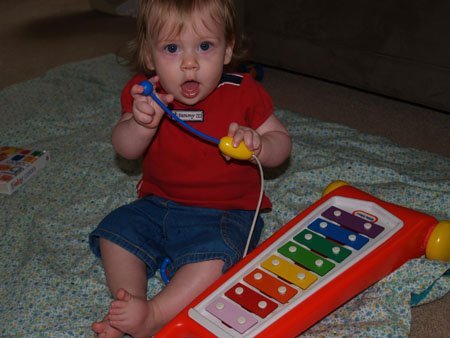 she's figured out that she can make noise (notice how i don't call it music :-P) on her toy xylophone by banging the mallet (usually not the right part of it) or some other toy on the bars (yet another thing to put on the list of things we should try to get video of)