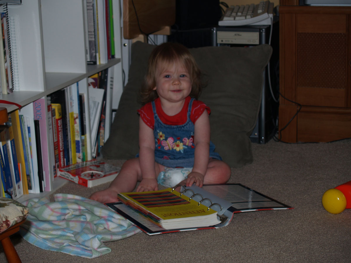 She likes to pull the books out of the bookcase in the living room. Here she decided to page through the Better Homes and Gardens Cookbook. Pretty soon we should be able to get her to cook dinner for us. I mean, really, it's about time she started pulling her weight around here. ;-)