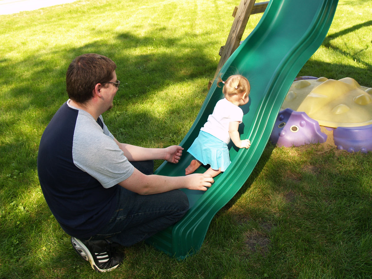 Sliding down the slide is still a little too scary, but trying to climb up it is just right.