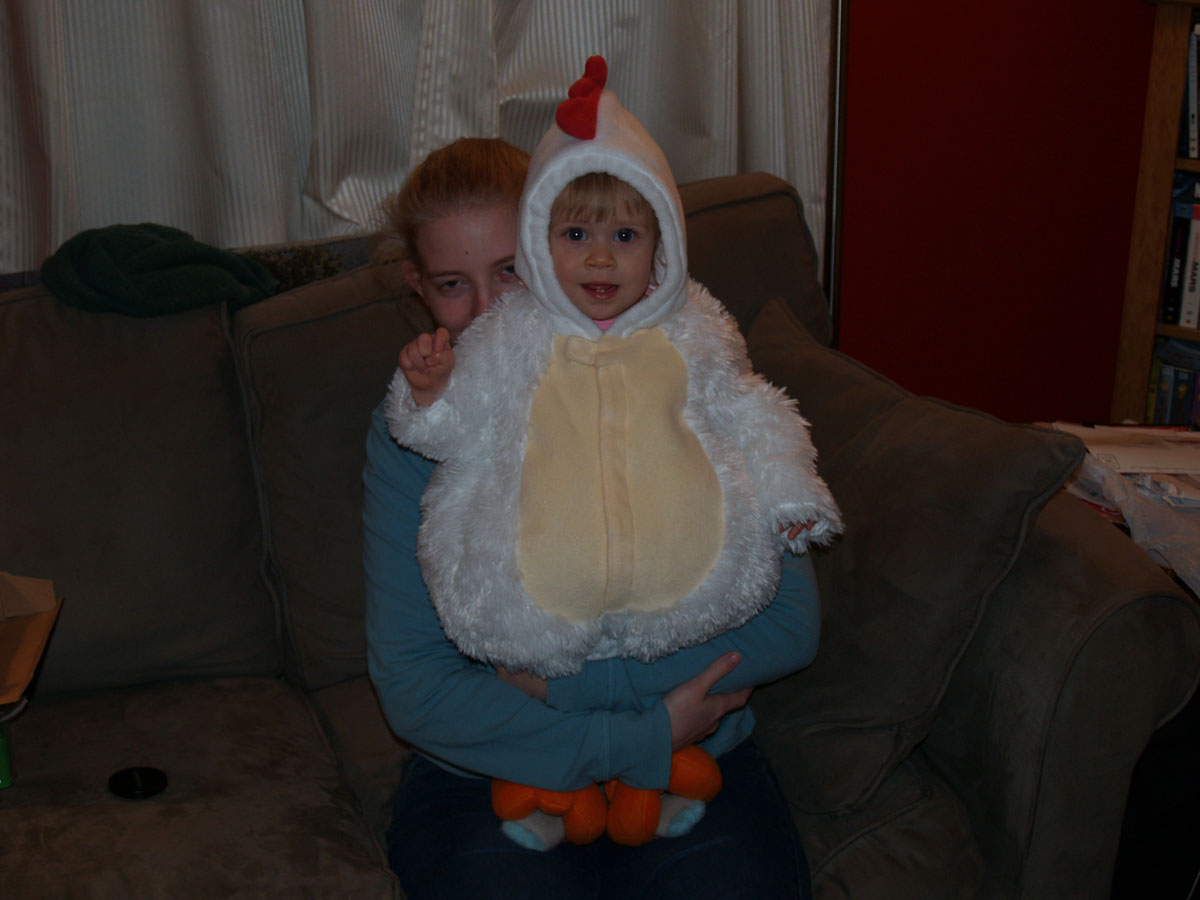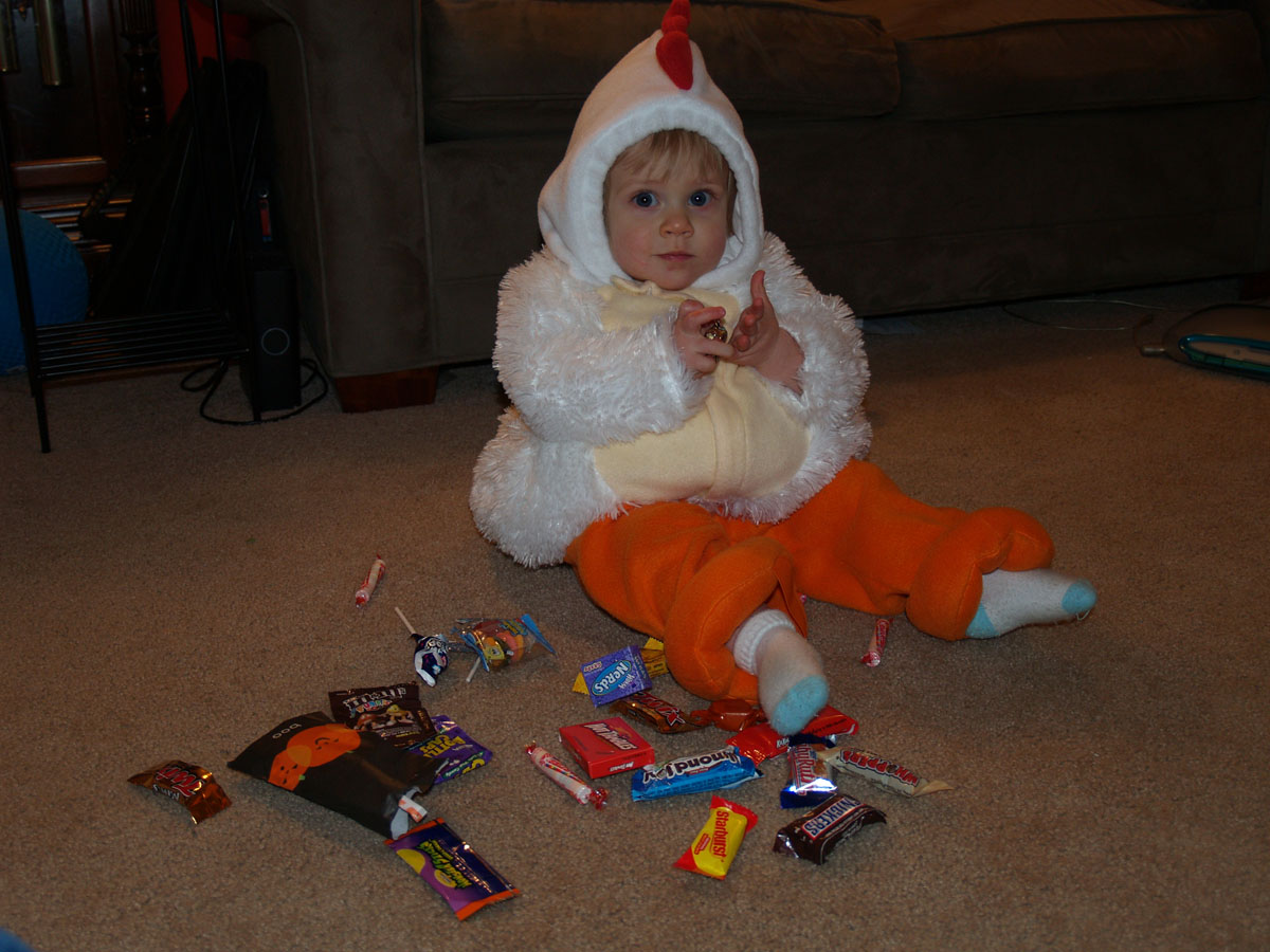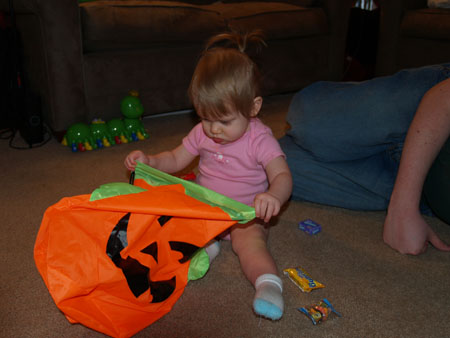 This wasn't Ava's first Halloween, but it was the first one for which she wasn't three days old. I took her trick-or-treating -- up and down our own street was pretty much it -- while Josh stayed home to hand out candy to the young'uns. She took it all pretty well, though she didn't exactly get into it (I couldn't even get her to hold onto her candy sack at any point). It was a chilly, kind of breezy evening, so I was glad she had a nice warm costume.