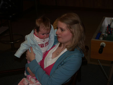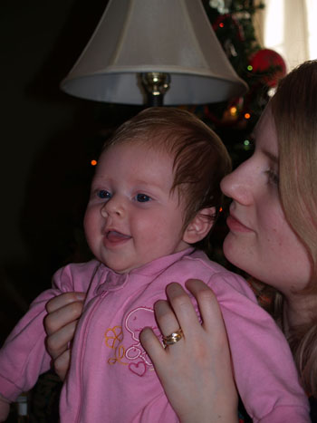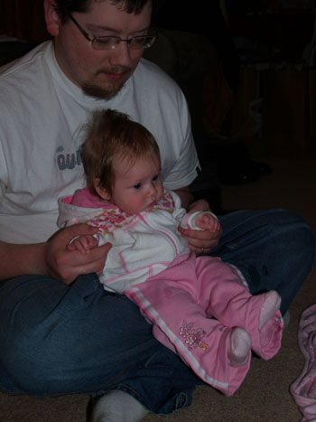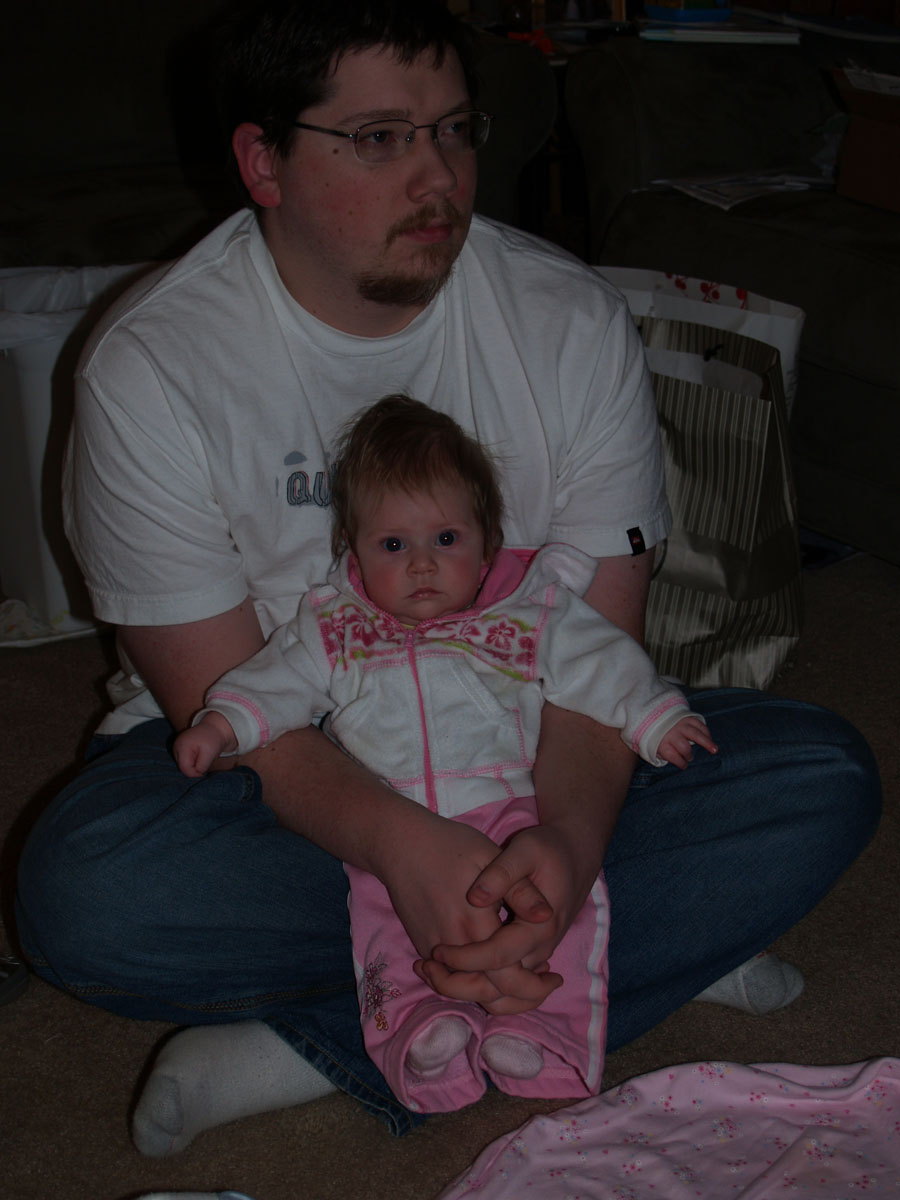 She likes to be sung to. There are lots of songs we sing to her (including one Josh came up with that's "The Hallelujah Chorus" with "Hello Ava" in place of "Hallelujah") but she seems especially fond of "Hey, Baby" (don't ask me who orininally sang it; I know it as an Iowa State pep band song) and "Head and Shoulders, Knees and Toes," which we of course do with actions pointing out each of her body parts.