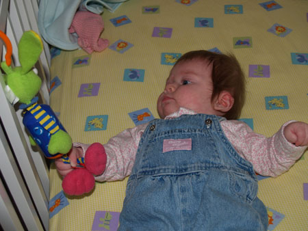 Ava has recently started becoming more "grabby." She has a jingly, dangly bunny toy on the side of her crib that she used to just bat at (or kick, if she had worked herself 90 -- or 270 -- degrees, which she started doing about a month ago), but lately she's started actually grabbing its skinny little legs and pulling it toward herself or just yanking it around. She'll also grab onto her link-a-doos (colorful plastic rings that link together) and actually hold on while she waves her arm around, tightening her grip if you pull on the other end. (Before she would occasionally close her fist around one, but would usually drop it fairly quickly because she wasn't really holding on intentionally.) And when she's on the changing table she'll usually grab onto the bars on the sides of the table with each hand. She's also started to grab onto her clothes when I'm trying to dress her, and even sometimes her diaper when I'm trying to put it on her. It's amazing how much this behavior has progressed even in just the past week or so; it's kind of fascinating to watch. My favorite manifestation of her increasing grabbiness, though, is that she grabs onto Mommy and Daddy (or our clothing -- or especially Mommy's hair) a lot more. It's very sweet. And occasionally painful. ;-)