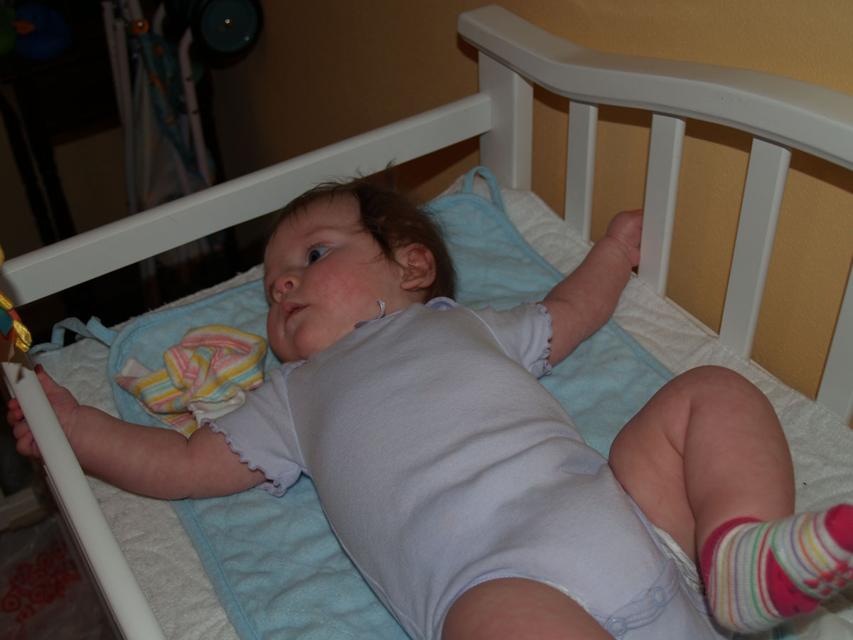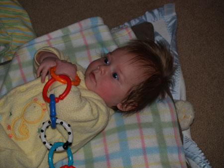 She's been a big fan of chewing/sucking on her hands for a while now, but she's recently started doing it with objects more, like the aforementioned rings and other toys we give her, some of which were designed to be chewed on (most baby toys are) and some of which aren't: we put Mr. Cowie (who is entirely plush) on her chest and she grabbed him with both hands and shoved him into her face, trying to eat him. Something tells me she's going to like her burgers and steak one day. ;-) We're not sure if she's just exploring objects with ther mouth, as babies do, or if she might actually be starting to teethe, which it seems a little early for, but isn't impossible.