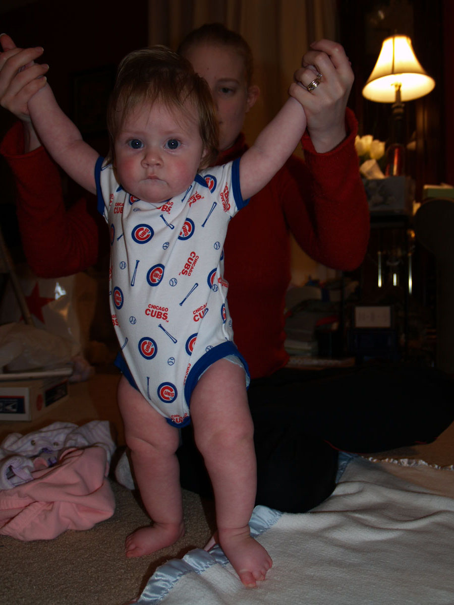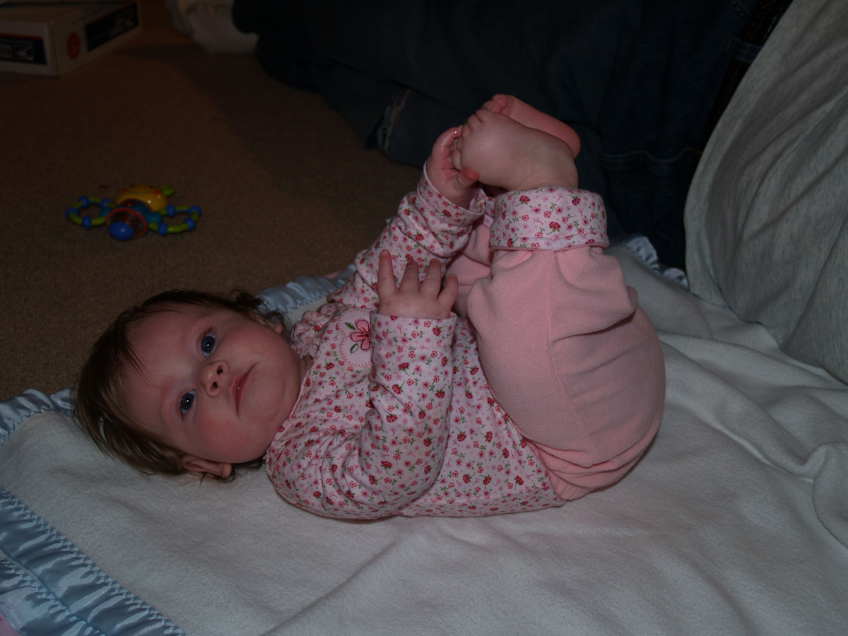 In the last month she's been smiling a whole lot more (though unfortunately not much at her recent "photo shoot"), started laughing, discovered her knees, started actually paying (some) attention to the books we read her, and noticeably improved her hand-eye coordination, especially when it comes to grabbing toys and getting them to her mouth (which is pretty much where everything goes these days). If we stick a hand in front of her, she'll reach out and grab it with both hands, kind of inspect it, and then usually -- of course -- try to put it in her mouth. When she's doing something like sitting in one of our laps, she'll sometimes wiggle around until she manages to get her butt on the floor, or just plain into a different position. It's obvious she wants to be able to do more than she physically can yet, so we're going to have to really watch out once she does start to move around on her own. We also used to only have to worry about her making noise in church if she was fussy, but she's so much more vocal now that even if she's in a good mood she can be noisy. Yup, life is getting more interesting.