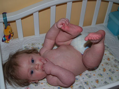 ...and we seem to have hit teething. We can't be 100% sure until we actually see a tooth breaking through, but based on several things -- including a recent night when she started crying in her crib shortly after we put her to bed and didn't stop on her own, which is very unusual at this point -- we're pretty confident that's what's going on. In other news, she seems to be about 15 3/4 pounds (we're not bothering to try to measure her length this time) and is a little rolling machine right now.