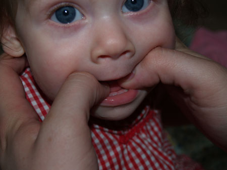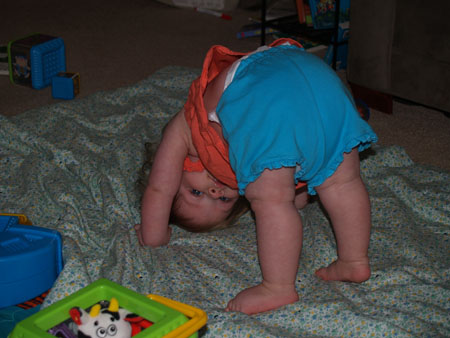 There haven't been a ton of big changes since last month, at least not the kind that are easily defined (other parents I'm sure will get how you can notice your child changing and growing, even if you can't pinpoint the exact things that have changed). She got her second tooth, of course, and can now get up on her hands and knees in a snap. She seems to get frustrated sometimes because she can't quite figure out how move once she's in that position; we're trying to show her what to do, but I don't know whether that will actually help or if it's something she just has to figure out on her own. It can't be too far off, though.