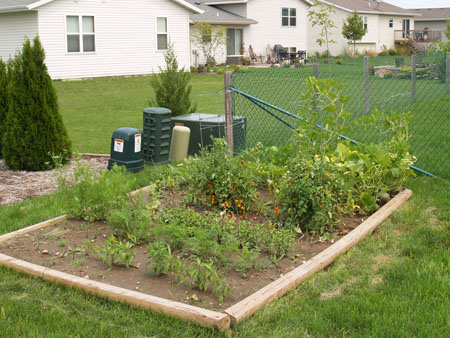 When we landscaped our front yard two years ago, we took all the grass/dirt we dug up (which was a lot) and dumped it in a pile in the back corner of our backyard -- because, well, we just didn't know what else to do with it. We always had plans of spreading it out and turning it into a garden, but it's just kind of sat there since then as we procrastinated. And, of course, the longer we procrastinated the more it became grown over with grass and weeds and so the more work it became to actually do anything about it. Earlier I mentioned in a post that we had bought some seeds and would be out a whopping $2 if we didn't get on the ball. Apparently that $2 was all the motivation we needed, because darn if we didn't actually do it. (Okay, in actuality there may have been other factors, but we can pretend.) We planted a little on the late side (mid-June), but not too bad. And we've started reaping the benefits, already having eaten cherry tomatoes, peas, basil and cilantro that we growed all by our bitty selves.