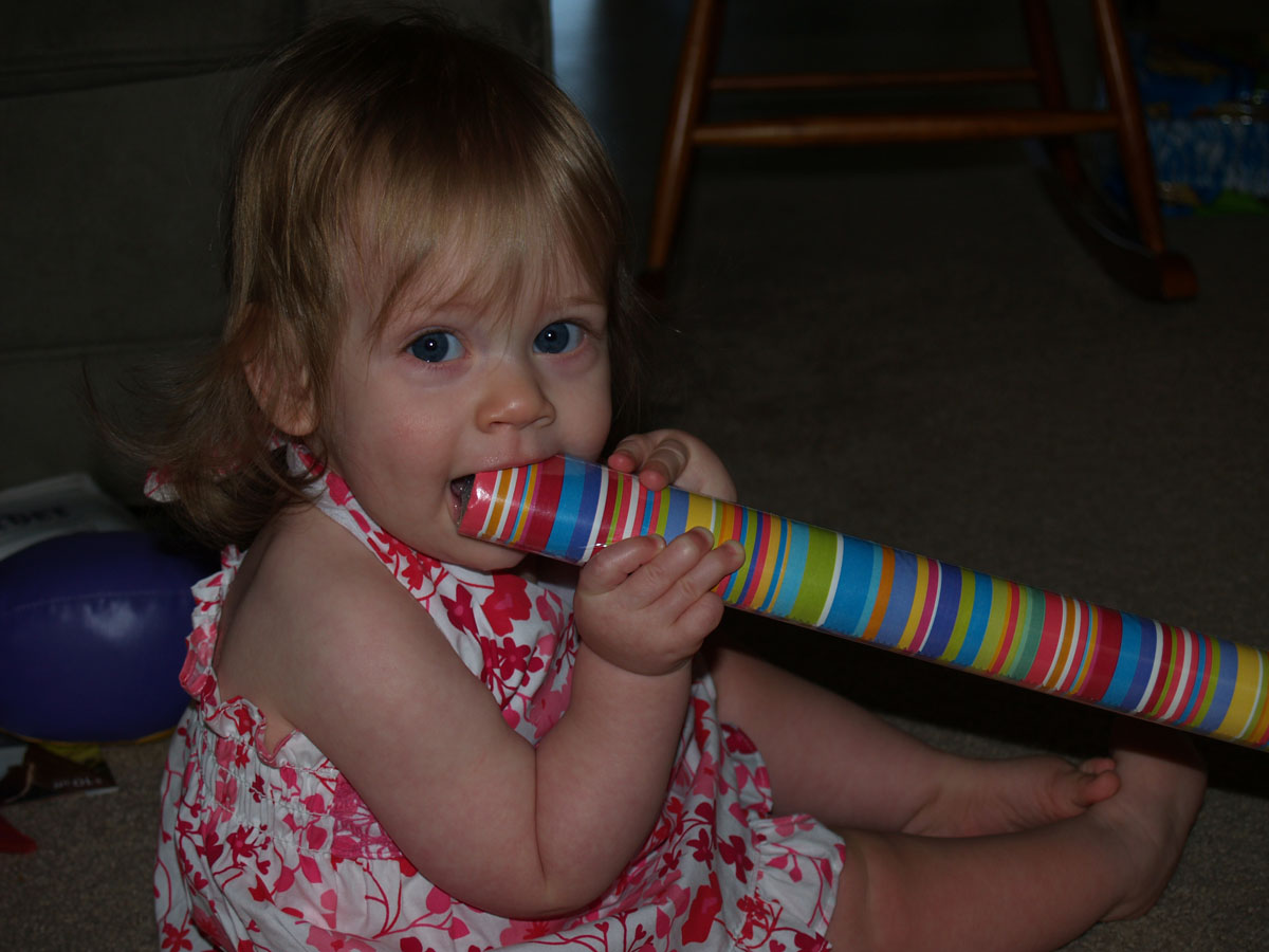 She's been teething again (on whatever she can get her gums on), and with good reason: her two upper teeth broke through this past week (sorry, it's not as easy to get a picture of those as of the bottom ones).