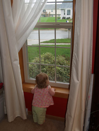 Recently she's seemed to favor the living room window more. (I like this photo a lot, despite the fact that you can't see her face. She looks so big and so little at the same time.)