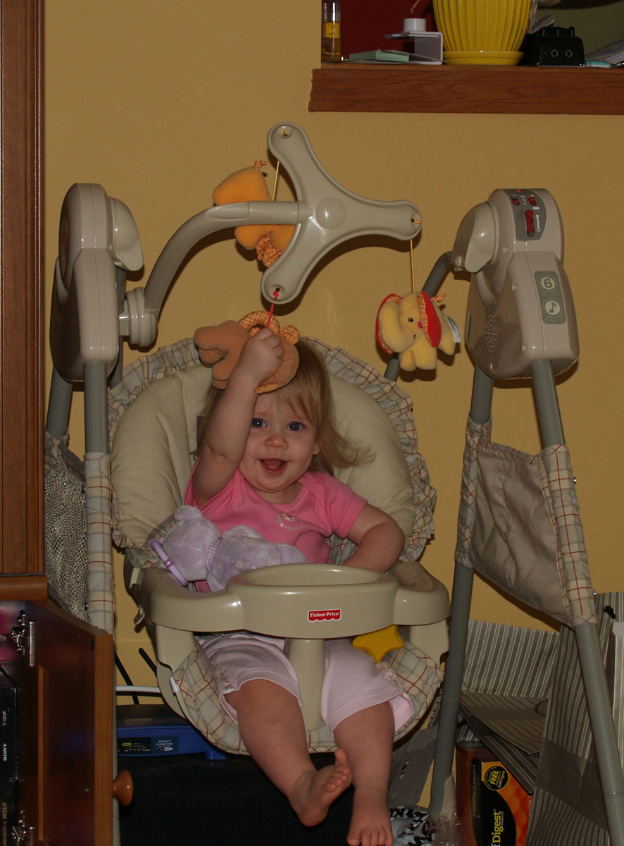 After several months of not using her baby swing, Ava's rediscovered it. She'll go stand by it and start swinging it with her hand when she wants to swing. And while she didn't much notice the mobile above it when she was little, now she grabs at the animals.
