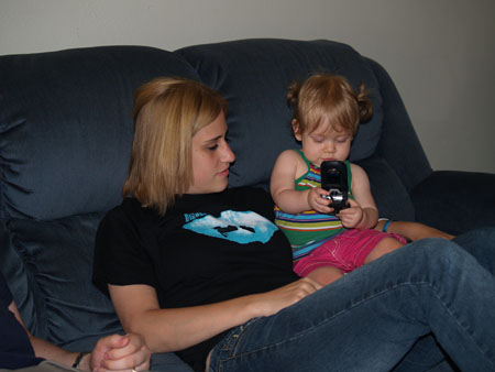 My cousin Rachel very nicely lets Ava play with her phone, and Ava in return sits on her lap.