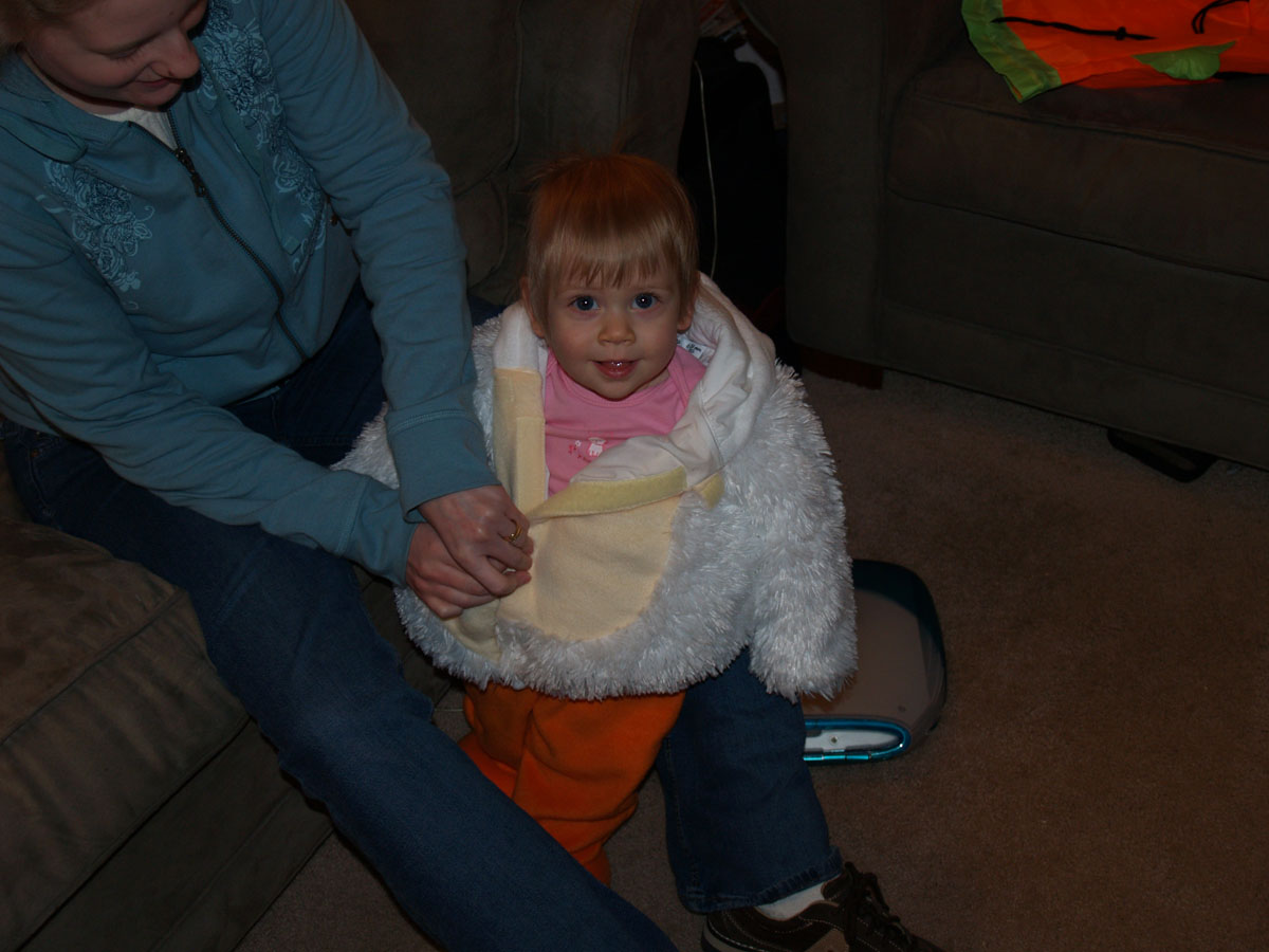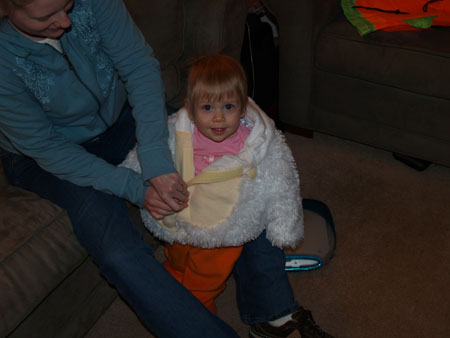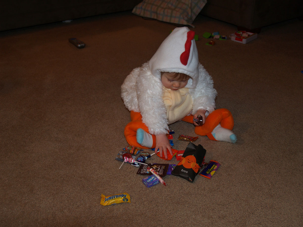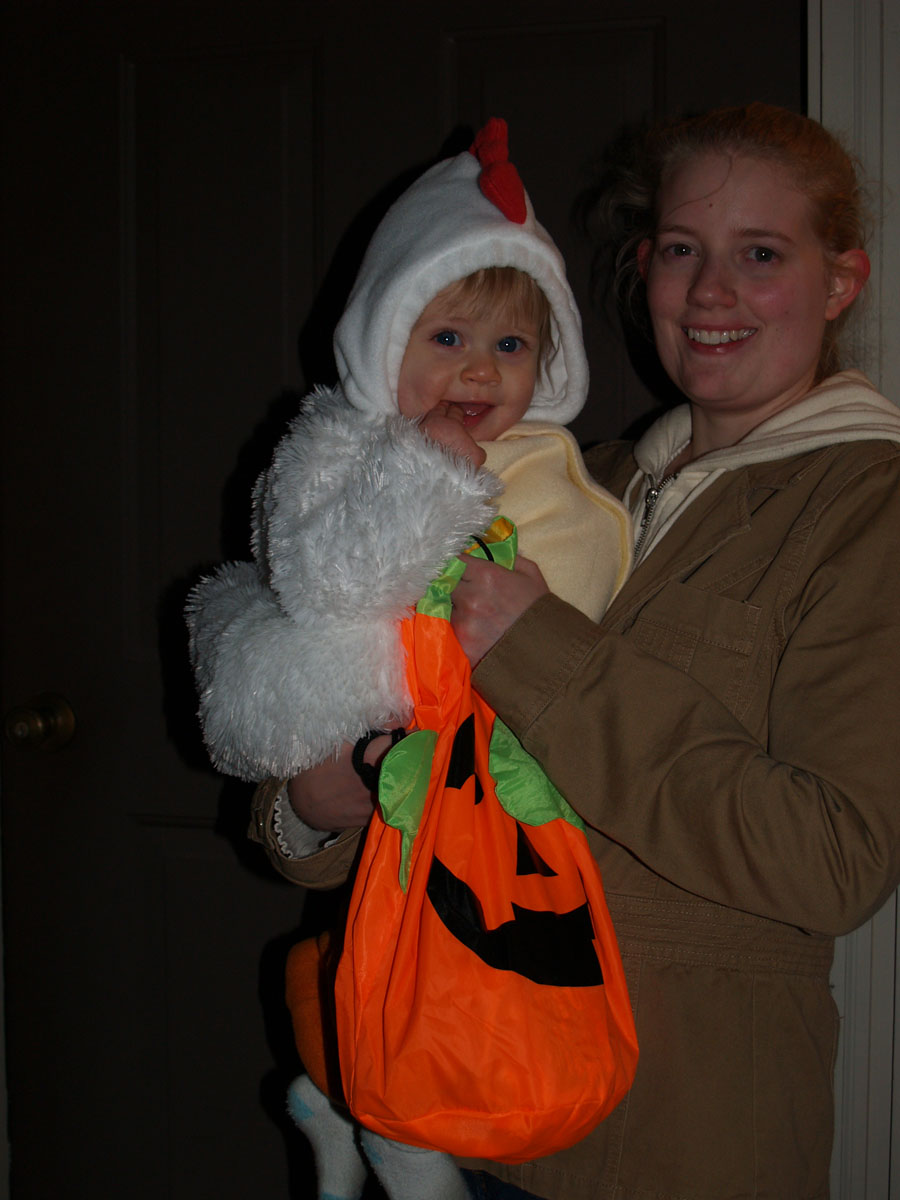 This wasn't Ava's first Halloween, but it was the first one for which she wasn't three days old. I took her trick-or-treating -- up and down our own street was pretty much it -- while Josh stayed home to hand out candy to the young'uns. She took it all pretty well, though she didn't exactly get into it (I couldn't even get her to hold onto her candy sack at any point). It was a chilly, kind of breezy evening, so I was glad she had a nice warm costume.